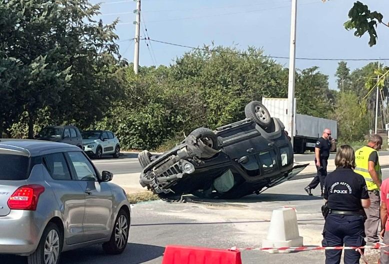 Από την ανατροπή του αυτοκινήτου τραυματίστηκε ο οδηγός, ένας άνδρας 65 περίπου ετών, ενώ και οι εργάτες των οδικών έργων γλίτωσαν «παρά τρίχα», καθώς το όχημα διέγραψε πορεία πολύ κοντά στο σημείο όπου εργάζονταν.