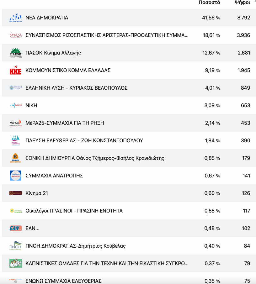 Τα αποτελέσματα στο νομό Λάρισας στο 15,11%: Μπροστά με 41.56% η Νέα Δημοκρατία – Στο 18,61% ο ΣΥΡΙΖΑ