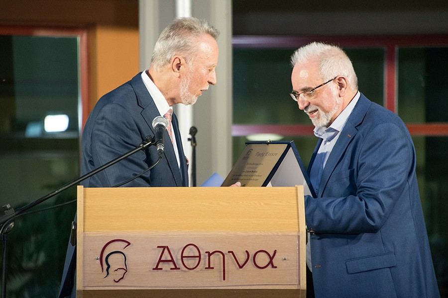 Ξεχωριστή στιγμή στην όλη εκδήλωση αποτέλεσε η βράβευση του επίτιμου Προέδρου των Εκπαιδευτηρίων «Αθηνά» κ. Γκίμτσα Βασίλειου. Την επίδοση της τιμητικής πλακέτας έκανε ο κ. Μανάκος και παίρνοντας τον λόγο ο κ. Γκίμτσας με μεγάλη συγκίνηση ευχαρίστησε όλους τους συνεργάτες του που στήριξαν το όνειρό του για ένα σχολείο υψηλών προδιαγραφών αλλά και την οικογένειά του για την μεγάλη βοήθεια που του προσέφερε σε όλες τις δυσκολίες που υπήρξαν τόσο στην προσωπική όσο και στην επαγγελματική του πορεία.