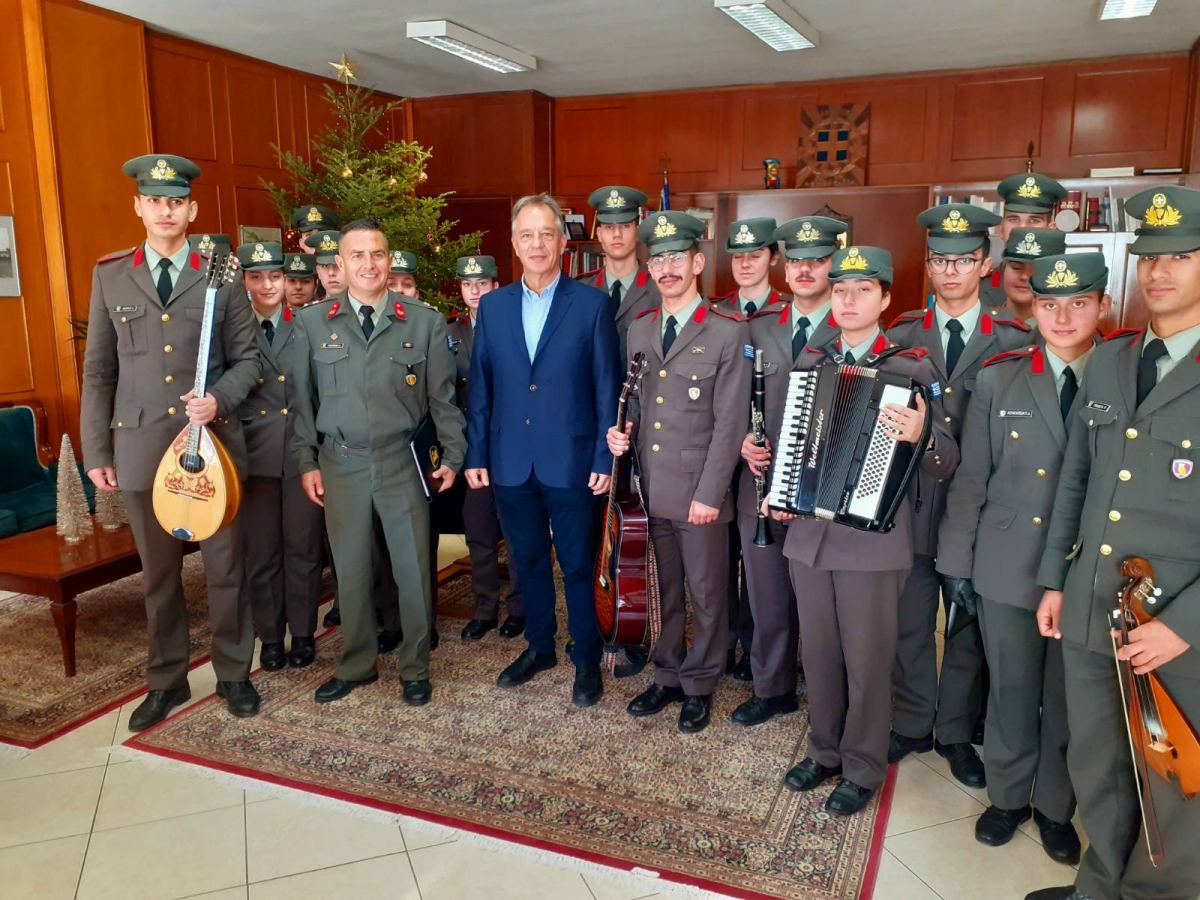 της Σχολής Μονίμων Υπαξιωματικών, να ψάλλουν τα κάλαντα στον Αντιπεριφερειάρχη