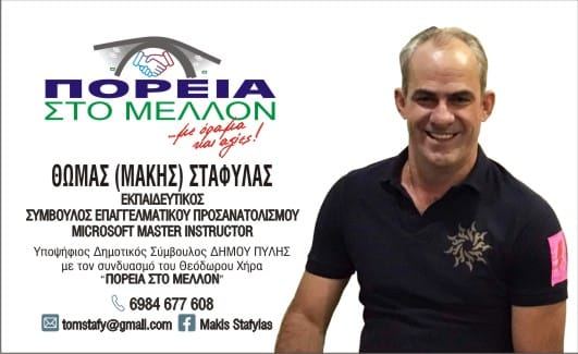 Ο υποψήφιος Δημοτικός Σύμβουλος ΔΗΜΟΥ ΠΥΛΗΣ με το συνδυασμό του Θοδωρή Χήρα “ΠΟΡΕΙΑ ΣΤΟ ΜΕΛΛΟΝ”  Μάκης Σταφυλάς είναι ένας επαγγελματίας διακεκριμένος στον κλάδο του και στο χώρο της εκπαίδευσης. Αποφάσισε την συστράτευση με τον συνδυασμό του Θοδωρή Χήρα, ας τον γνωρίσουμε: