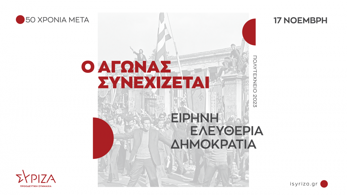 Ο ΣΥΡΙΖΑ-Προοδευτική Συμμαχία καλεί όλους τους πολίτες να συμμετέχουν στις εκδηλώσεις μνήμης και διαμαρτυρίας. Όσο και αν κάποιοι επιθυμούν να διαστρεβλώνουν τα γεγονότα του 1973 και να συσκοτίζουν τα μηνύματα της ιστορικής εξέγερσης, το Πολυτεχνείο πλανάται σαν σκιά τα τελευταία 50 χρόνια πάνω από την Ιστορία, για να θυμίζει ότι τίποτα δεν χαρίζεται στο λαό, εάν ο ίδιος δεν το διεκδικήσει.
