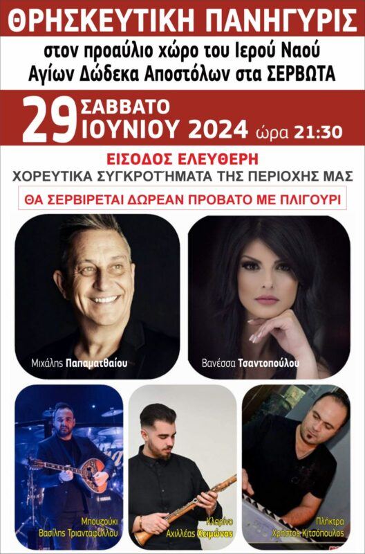 Το Σάββατο 29 Ιουνίου, παραμονή των Αγίων Αποστόλων, η εκκλησία Σερβωτών σας προσκαλεί σε ένα μοναδικό Πανηγύρι με προβατίνα και πλιγούρι. Η εκδήλωση θα πραγματοποιηθεί στον προαύλιο χώρο του Ναού με ώρα έναρξης 21:30.