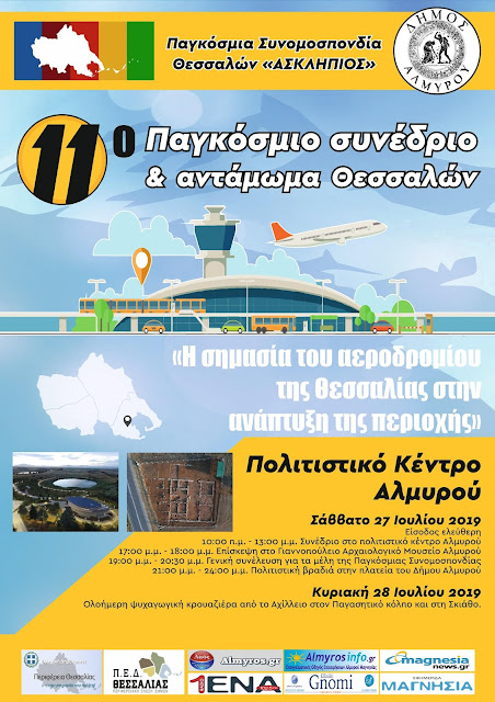 Όπως κάθε χρόνο έτσι και φέτος η Παγκόσμια Συνομοσπονδία Θεσσαλών με αισθήματα αγάπης, νοσταλγίας και περηφάνειας για τη Θεσσαλία και την πατρίδα Ελλάδα διοργανώνει σε συνεργασία με τον Δήμο Αλμυρού, την Περιφέρεια Θεσσαλίας καθώς και την ΠΕΔ Θεσσαλίας το 11ο παγκόσμιο συνέδριο και αντάμωμα Θεσσαλών στις 27 και 28 Ιουλίου 2019 στον Δήμο Αλμυρού.