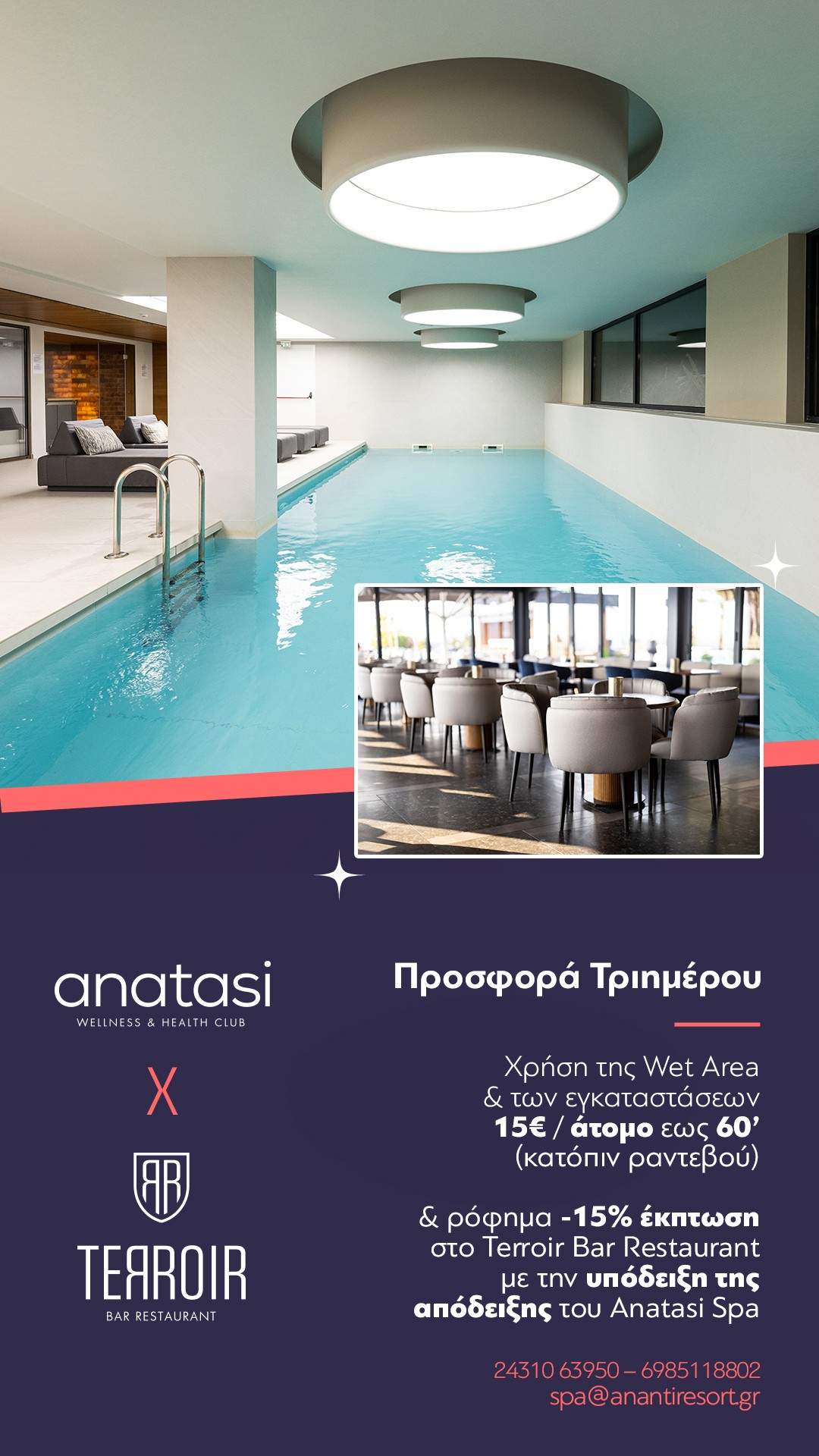 Τριήμερο χαλάρωσης & απόλαυσης στο Anatasi Spa & Terroir Bar Restaurant! Μόνο για το Σάββατο, Κυριακή & Δευτέρα 7-8-9 Ιουνίου: Χρήση της Wet Area με 15€ / άτομο για έως 60’ (κατόπιν ραντεβού)