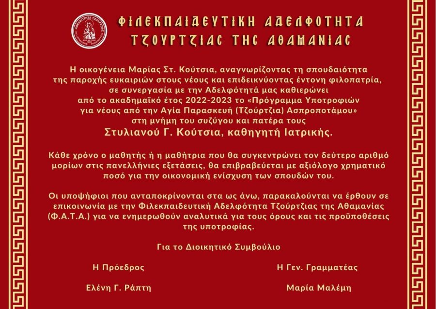 Συγχαρητήρια στην Οικογένεια Μαρία Στ. Κούτσια που στην μνήμη του αξιολογότατου Καθηγητή της Ιατρικής των πανεπιστημίων Θεσσαλίας και Ιωαννίνων, Στέλιου Γ. Κούτσια, που με την προσφορά τους στηρίζουν νέους φοιτητές και ταυτόχρονα υπηρετούν τους ιδρυτικούς στόχους της ΦΙΛΕΚΠΑΙΔΕΥΤΙΚΗΣ Αδελφότητας Τζούρτζιας της Αθαμανίας. Κάθε χρόνο ένας μαθητής θα επιβραβεύεται με χρηματικό ποσό για τις σπουδές του.