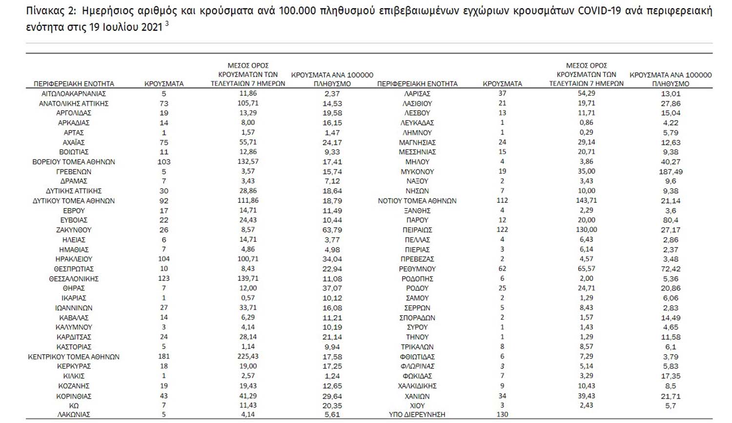 Σε όλη τη χώρα, με βάση τα δεδομένα που έχουν δηλωθεί στον ΕΟΔΥ και καταγραφεί μέχρι τις 19 Ιουλίου 2021 (ώρα 15:00), τα νέα εργαστηριακά επιβεβαιωμένα κρούσματα της νόσου που καταγράφηκαν τις τελευταίες 24 ώρες είναι 1.834, εκ των οποίων 14 εντοπίστηκαν κατόπιν ελέγχων στις πύλες εισόδου της χώρας.
