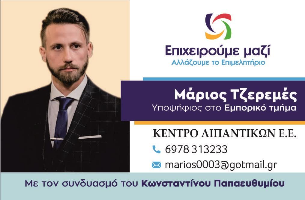 Ο Μάριος Τζερεμές, συνιδιοκτήτης της εταιρείας “Κέντρο Λιπαντικών Ε.Ε.” μαζί με τον Λευτέρη Τζερεμέ, είναι υποψήφιος για το Επιμελητήριο Τρικάλων στις επερχόμενες εκλογές της 17ης και 18ης Νοεμβρίου.