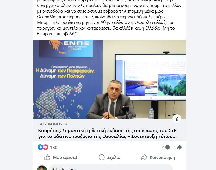 «Μόνο με παρόμοιες άμεσες κυβερνητικές αποφάσεις, με διαφάνεια και συνεργασία όλων των Θεσσαλών, θα μπορέσουμε να ατενίσουμε το μέλλον με αισιοδοξία», δήλωσε χαρακτηριστικά, προσθέτοντας ότι η Θεσσαλία μπορεί να αποτελέσει πρότυπο παραγωγικού μοντέλου, αλλά η κατάρρευσή της θα έχει συνέπειες για όλη την Ελλάδα.
