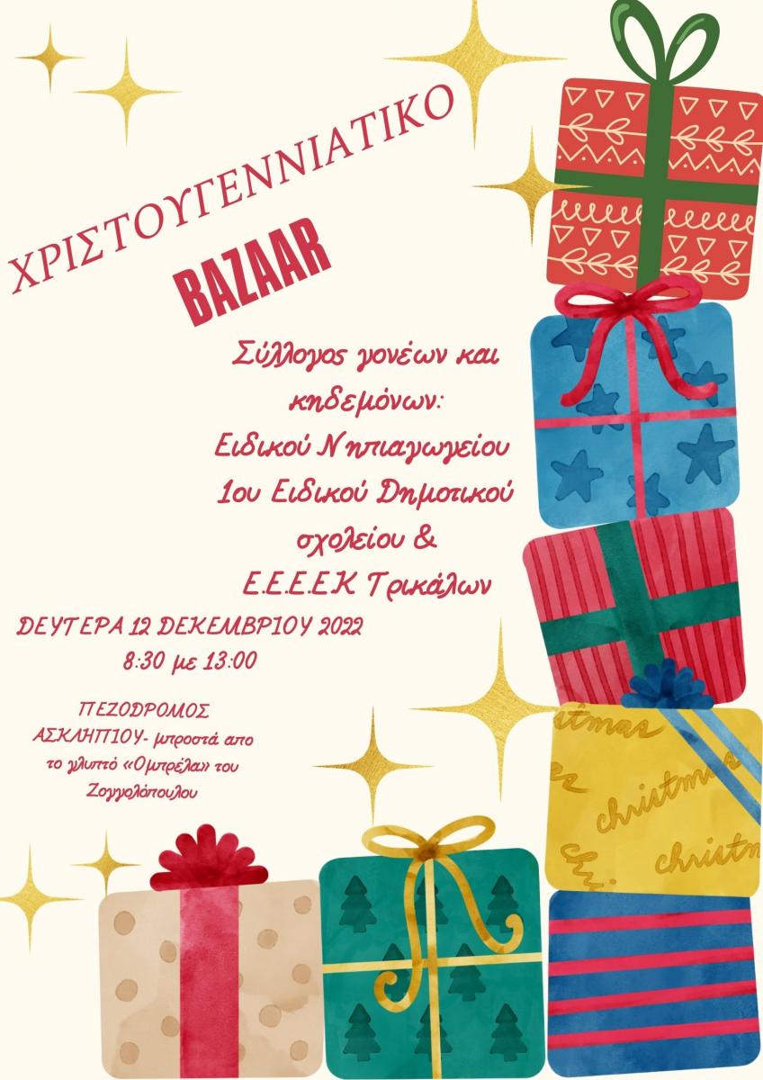 Ο Σύλλογος Γονέων και Κηδεμόνων του Ειδικού Νηπιαγωγείου, του 1ου Ειδικού Δημοτικού Σχολείου και Εργαστηρίου Ειδικής Επαγγελματικής Εκπαίδευσης (Ε.Ε.Ε.ΕΚ.) Τρικάλων, σας προσκαλεί στο Χριστουγεννιάτικο bazaar που θα διεξαχθεί τη Δευτέρα 12 Δεκεμβρίου, από τις 08:30 το πρωί έως τις 20:00 το βράδυ, στον πεζόδρομο της Ασκληπιού (μπροστά από το γλυπτό «Ομπρέλα» του Ζογγολόπουλου). Θα περιλαμβάνει κατασκευές που έχουν δημιουργηθεί από τους μαθητές/τριες των σχολείων με τη βοήθεια των εκπαιδευτικών των ειδικοτήτων Χειροτεχνίας. Τα έσοδα θα διατεθούν για την κάλυψη των αναγκών των σχολείων.