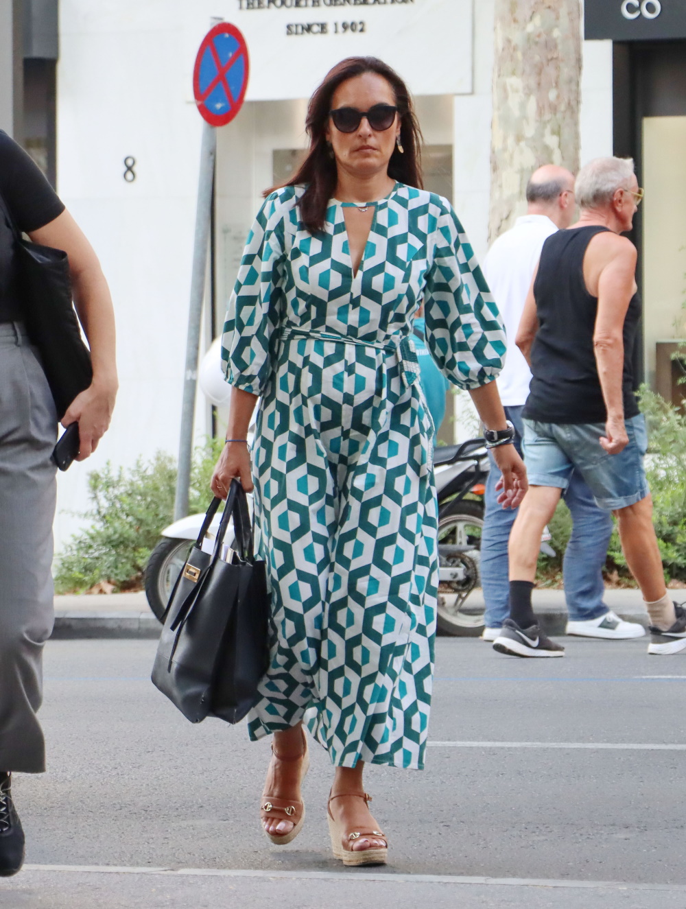 Η Όλγα Κεφαλογιάννη ολοκλήρωσε το σύνολο με εσπαντρίγιες πλατφόρμες σε ουδέτερο τόνο, και μεγάλη μαύρη tote bag.
