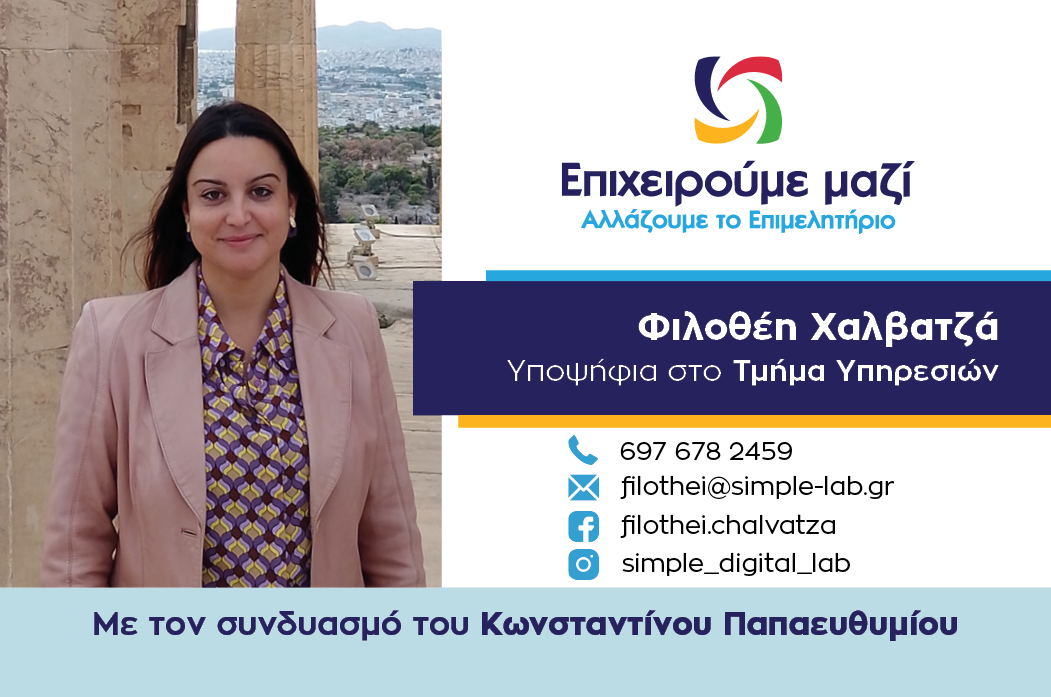 Μια γυναικεία εκπροσώπηση από την περιοχή της Φαρκαδόνας διεκδικεί την εκλογή της στον επιμελητηριακό θεσμό στο Τμήμα Υπηρεσιών με τον συνδυασμό του Κωνσταντίνου Παπαευθυμίου. Η Φιλοθέη Χαλβατζά, δραστήρια επαγγελματίας, ασχολείται με την εταιρία της, τη SIMPLE, η οποία εξειδικεύεται στον τομέα της Συμβουλευτικής και του Ψηφιακού Μετασχηματισμού. Οι επαγγελματικοί της τίτλοι περιλαμβάνουν την “Σχεδιάστρια Υπηρεσιών, Διαδικασιών & Ψηφιακών Προϊόντων” και την “Τεχνολόγο της Εκπαίδευσης”, αναδεικνύοντας το ευρύ φάσμα των δεξιοτήτων της στην υποστήριξη της σύγχρονης επιχειρηματικότητας.