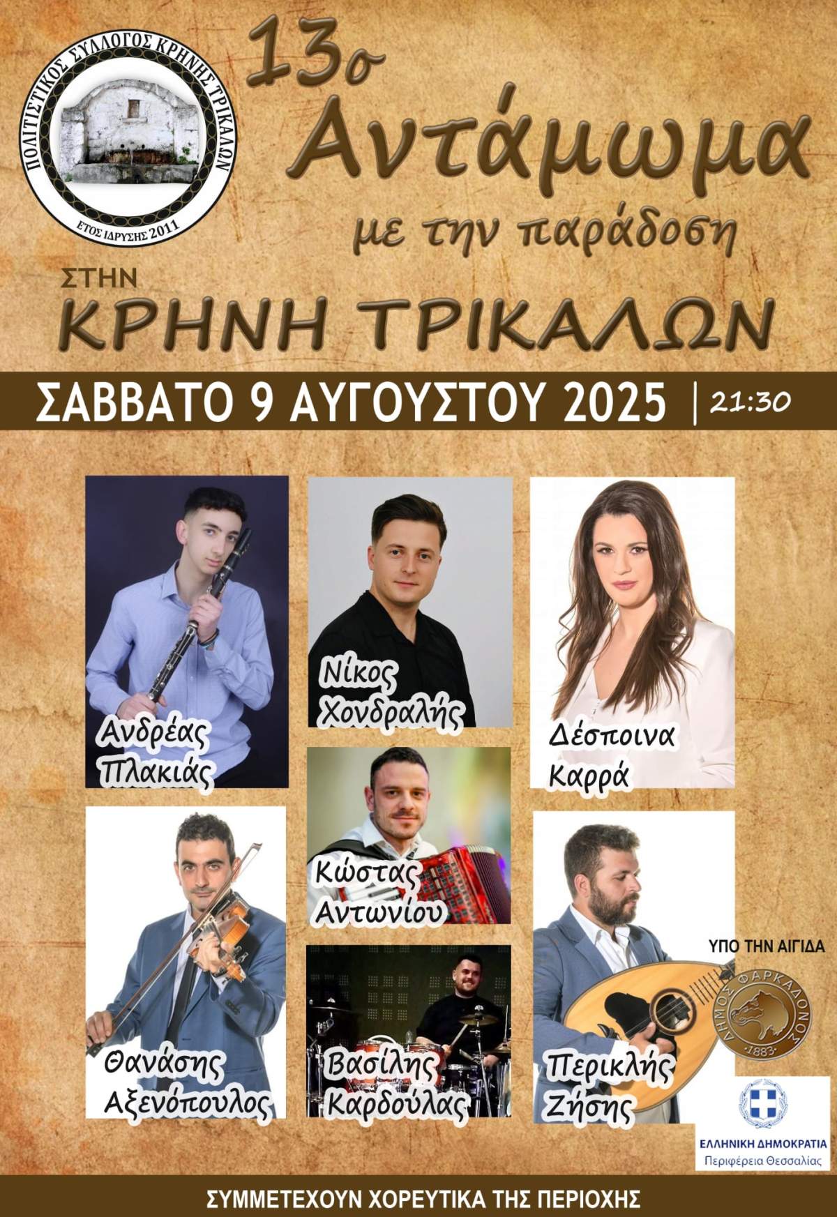 Το καλοκαίρι του 2025 αποκτά ξεχωριστό χρώμα στην Κρήνη Τρικάλων, καθώς το Σάββατο 9 Αυγούστου, στις 21:30, ο Πολιτιστικός Σύλλογος Κρήνης διοργανώνει το 13ο Αντάμωμα με την Παράδοση, μια βραδιά που έχει καθιερωθεί ως μία από τις σημαντικότερες εκδηλώσεις του Δήμου Φαρκαδόνας και της ευρύτερης περιοχής.