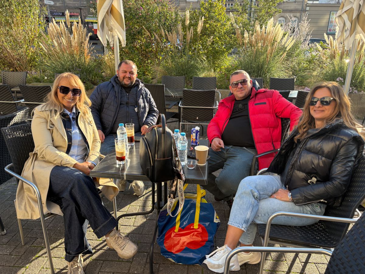 Στον κεντρικό δρόμο της ελληνικής συνοικίας της Νυρεμβέργης, εκεί όπου χτυπά η καρδιά της ομογένειας,Fuertherstrasse ένα στιγμιότυπο έξω από το γνωστό Café Arena μαγνήτισε τα βλέμματα. Οι Τρικαλινοί επιχειρηματίες και έμποροι αυτοκινήτων Βαγγέλης Παππάς και Λευτέρης Λόζιος , σε μια χαλαρή αλλά… στρατηγική επαγγελματική ανάπαυλα, απόλαυσαν τον ζεστό φθινοπωρινό ήλιο παρέα με τις συνεργάτιδές τους, επιχειρηματίες Μαίρη και Άννα.