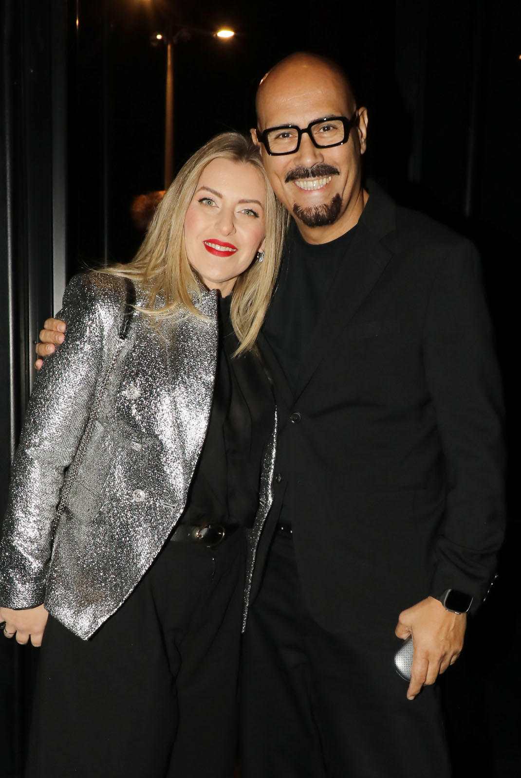 O Δημήτρης Σκουλός ντυμένος στα μαύρα πήρε αγκαλιά την όμορφη σύζυγό του, Τζέλα, και πόζαρε χαμογελαστός στον φωτογραφικό φακό.