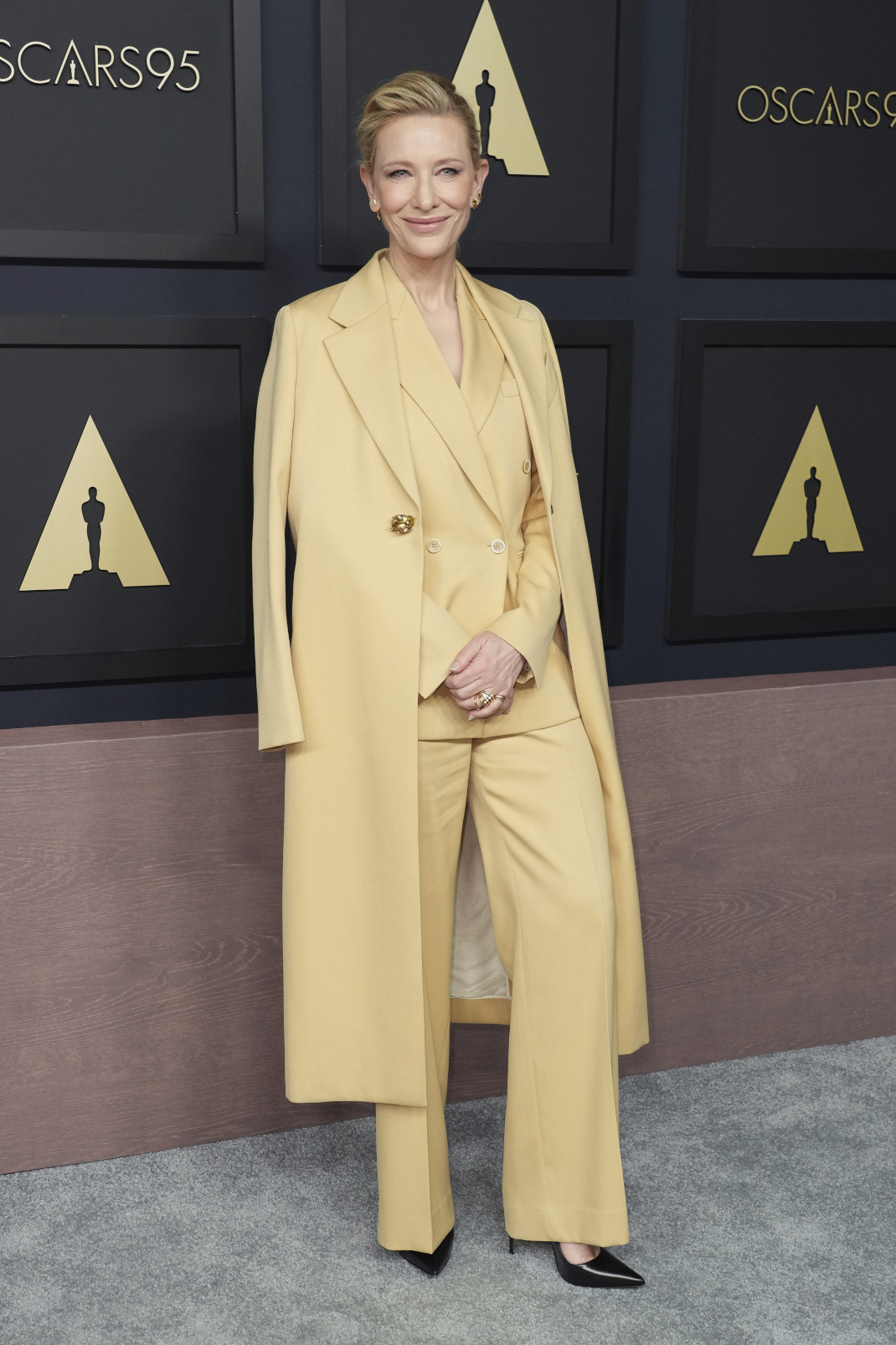 Φορώντας ένα κοστούμι του οίκου Lanvin σε απαλό κίτρινο χρώμα, η Κέιτ Μπλάνσετ παρέδωσε μαθήματα κομψότητας και φινέτσας, υιοθετώντας ένα μονόχρωμο look. Πάνω από το κοστούμι φόρεσε ένα Lanvin παλτό στο ίδιο χρώμα και μαύρες γόβες.