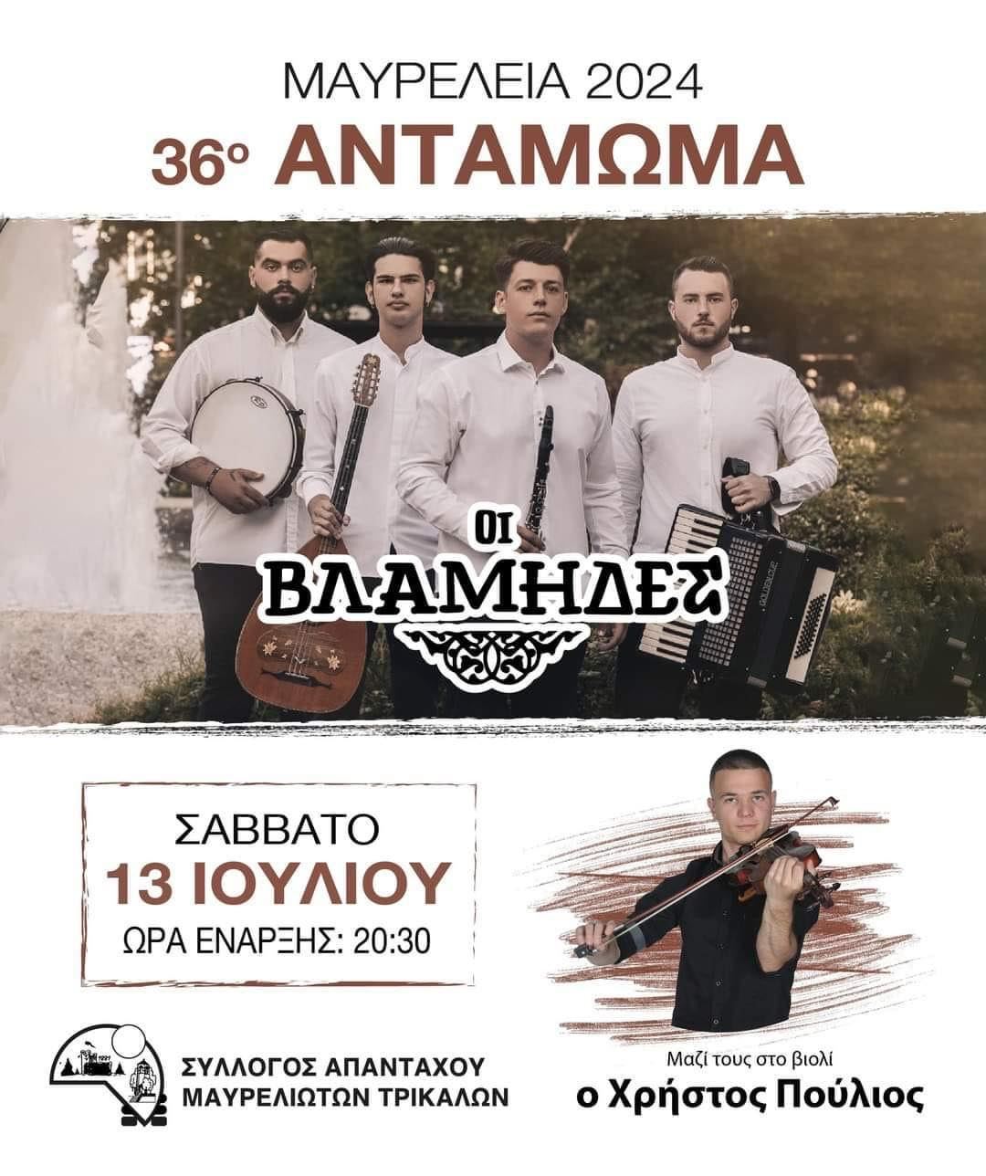 Το Σάββατο 13 Ιουλίου 2024 στις 20:00, ο Σύλλογος Απανταχού Μαυρελιωτών διοργανώνει το 36ο Αντάμωμα- γλέντι στη πλατεία του χωριού, στο Μαυρέλι Καλαμπάκας Τρικάλων. Θα μας πλαισιώσουν μουσικά με παραδοσιακές μελωδίες Οι Βλάμηδες , η κομπανία από Θεσσαλία που ξεσηκώνει σε γλέντια και πανηγύρια. Μαζί τους στο βιολί, ο συγχωριανός μας Χρήστος Πούλιος. Η εκδήλωση θα ξεκινήσει με παρουσίαση χορών από Θεσσαλία του Χορευτικού του Συλλόγου υπό την καθοδήγηση της δασκάλας χορών, την κ. Σιακαβάρα Ντίνα.