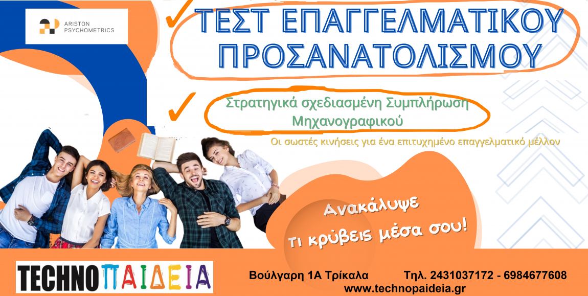 Το πλέον αξιόπιστο τεστ επαγγελματικού προσανατολισμού Άριστον και η στρατηγικά σχεδιασμένη συμπλήρωση μηχανογραφικού σε συνεργασία με τον ειδικό Στράτο Στρατηγάκη είναι προσωπική υπόθεση του κέντρου TechnoΠΑΙΔΕΙΑ. Με το Άριστον Τεστ Επαγγελματικού Προσανατολισμού θα πάρεις μια από τις πιο σημαντικές αποφάσεις της ζωής σου! Μπορείς να το κάνεις όσο είναι νωρίς, από Β΄ Γυμνασίου έως και Γ΄ λυκείου. Είμαστε σίγουροι ότι τα αποτελέσματα θα σε βοηθήσουν να επιλέξεις τη σωστή κατεύθυνση, καθώς και να συμπληρώσεις με επιτυχία το μηχανογραφικό σου! Και επειδή η ώρα για τη συμπλήρωση του μηχανογραφικού έφτασε. Το κέντρο μας, TechnoΠΑΙΔΕΙΑ είναι δίπλα σας ώστε να το συμπληρώσετε σωστά και έξυπνα.