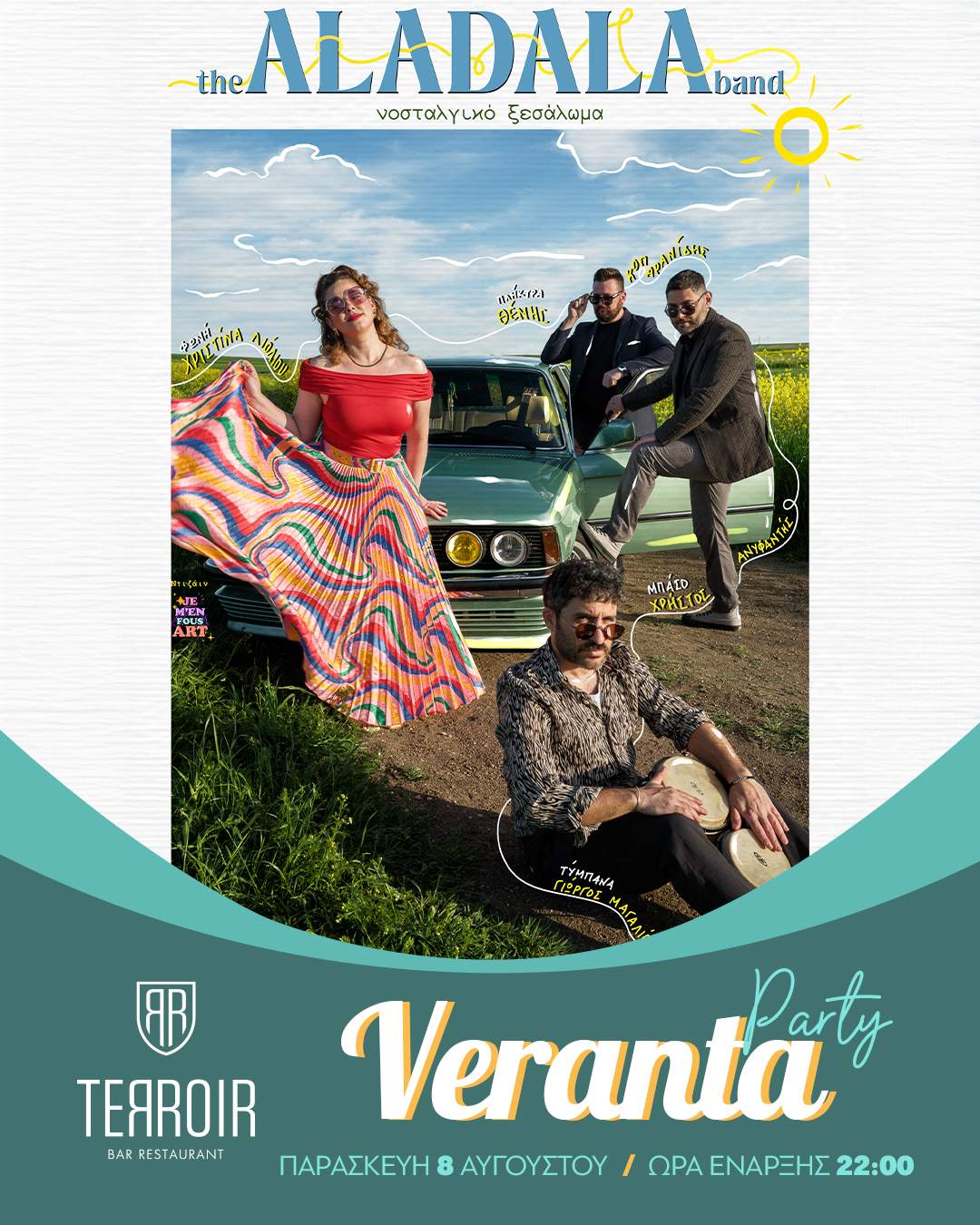 Η βεράντα του TERROIR γεμίζει ήχους και ενέργεια με τους The Aladala Band live on stage! Μουσικές που σε παρασύρουν και ένα σκηνικό που θυμίζει κινηματογραφική σκηνή κάτω από τον νυχτερινό ουρανό.