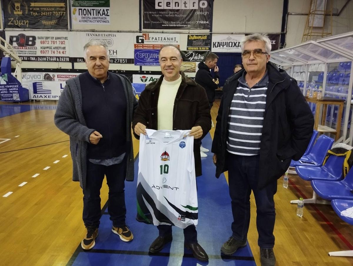 Τη νέα φανέλα της ομάδας trikala basket δώρισαν ο πρόεδρος Σκρέτας Κωνσταντίνος και το μέλος και υποστηρικτής της ομάδας Γκέκας Γιώργος στον μεγάλο χορηγό της ομάδας Γρηγορίου Βασίλη(ιδρυτής και διευθύνων συμβουλος της Advent Technologies)