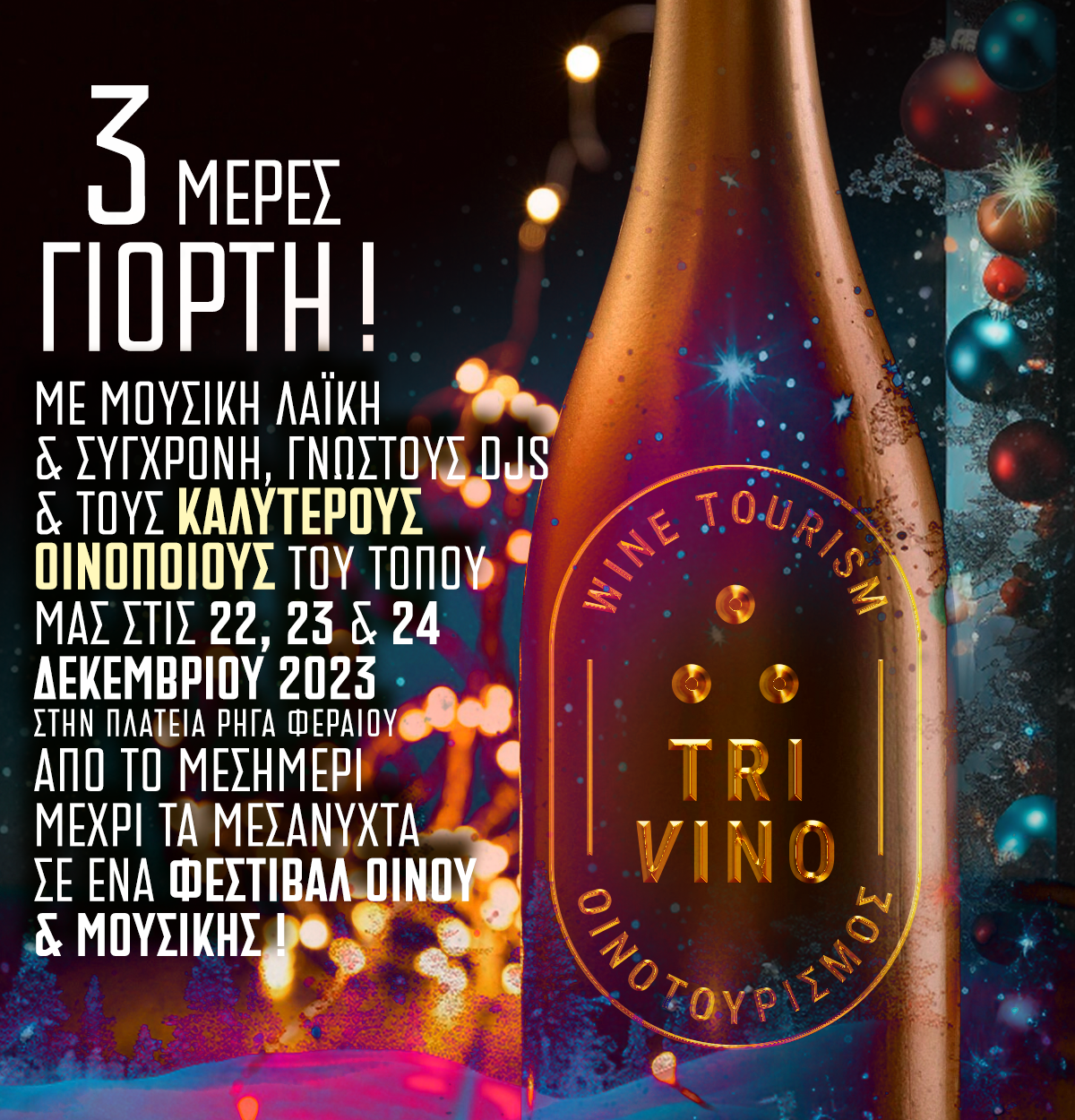 Άλλη μια πρωτότυπη και σημαντική εκδήλωση διοργανώνει ο Δήμος Τρικκαίων. Αυτή τη φορά για τον τρικαλινό οίνο, που σε συνδυασμό με δράσεις και εκδηλώσεις μουσικής, για 3 μέρες στο κέντρο της πόλης, φιλοδοξεί να δώσει άλλη μια νότα γιορτής, λίγο πριν τα Χριστούγεννα. Ο αντιδήμαρχος Παδείας, Πολιτισμού και Αθλητισμού Μιχάλης Λάππας τόνισε ότι «η γιορτή δίνει τον τόνο της χαράς στην πόλη, με πολλά και διαφορετικά μουσικά συγκροτήματα και με την ευκαιρία να γνωρίσουμε το κρασί της περιοχής μας».